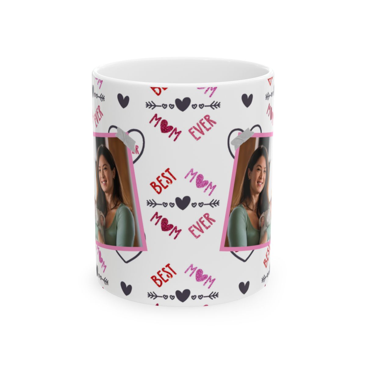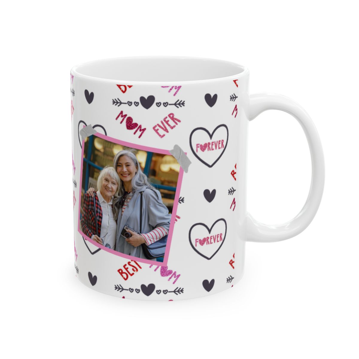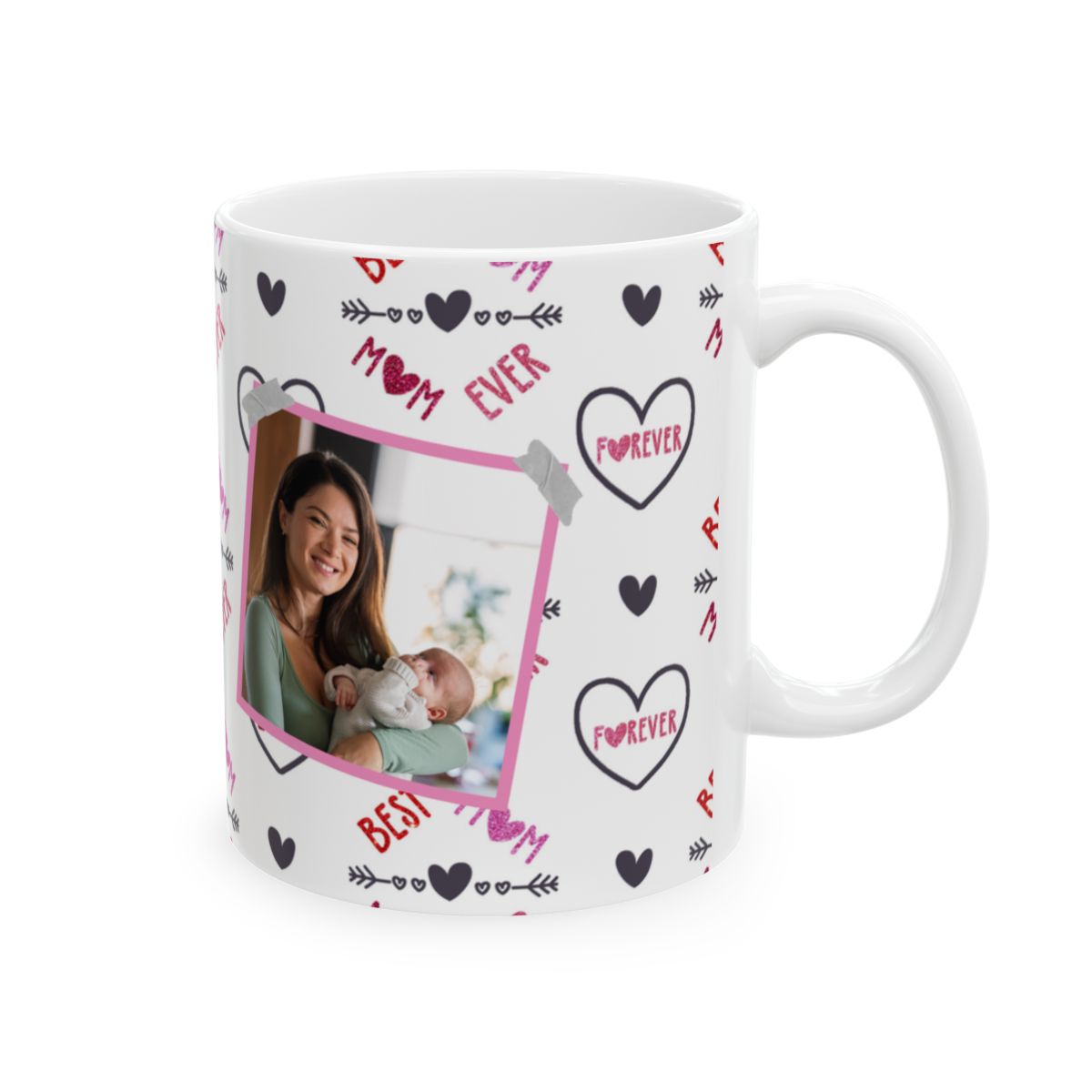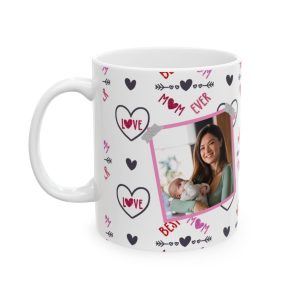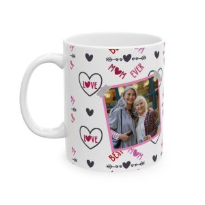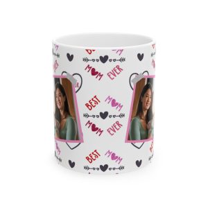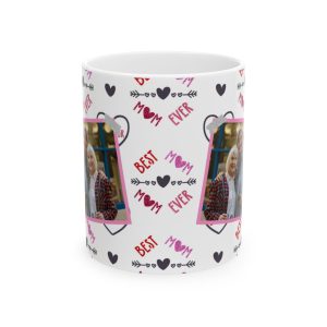 Show your mom some love with this Best Mom Ever personalized picture mug adorned with love hearts. This ceramic mug is perfect for daily use and can be a heartwarming gift for Mother’s Day, her birthday, or any special occasion. The vibrant colors and durable white ceramic make this mug a standout addition to anyone’s morning coffee routine.
