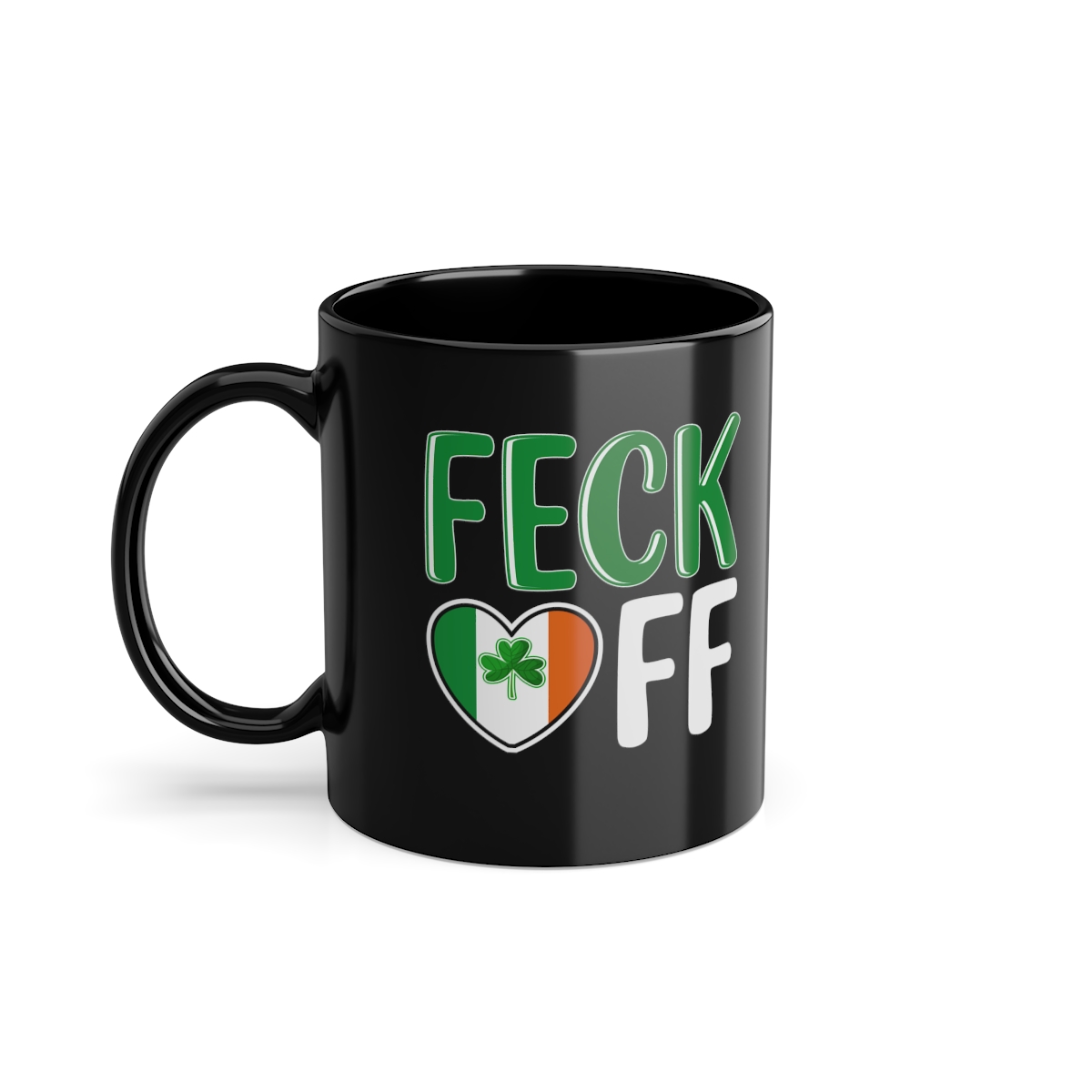 Feck off Funny Irish Mug. Its BPA and lead-free, microwave and dishwasher-safe, and made of black durable ceramic in 11-ounce sizes.?
