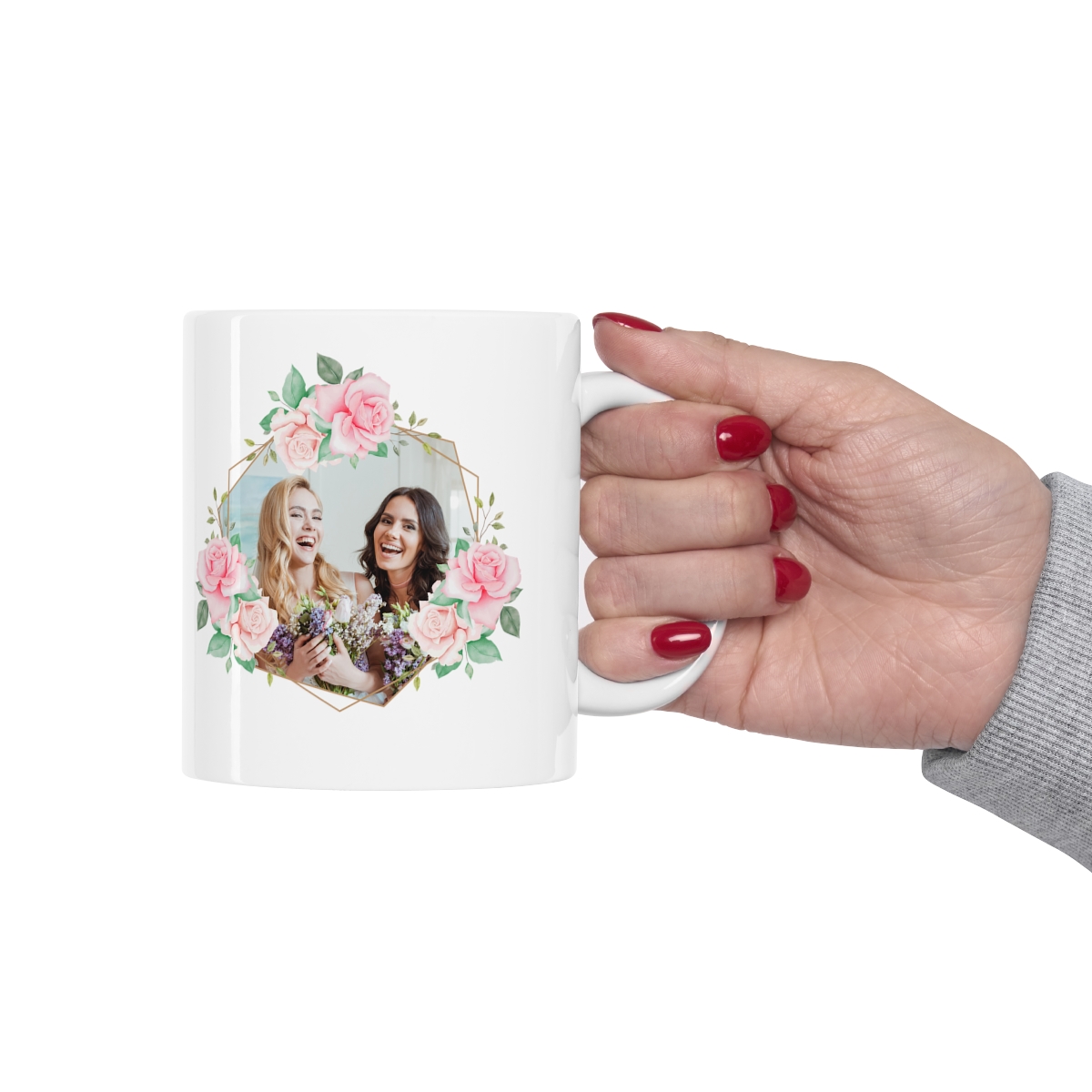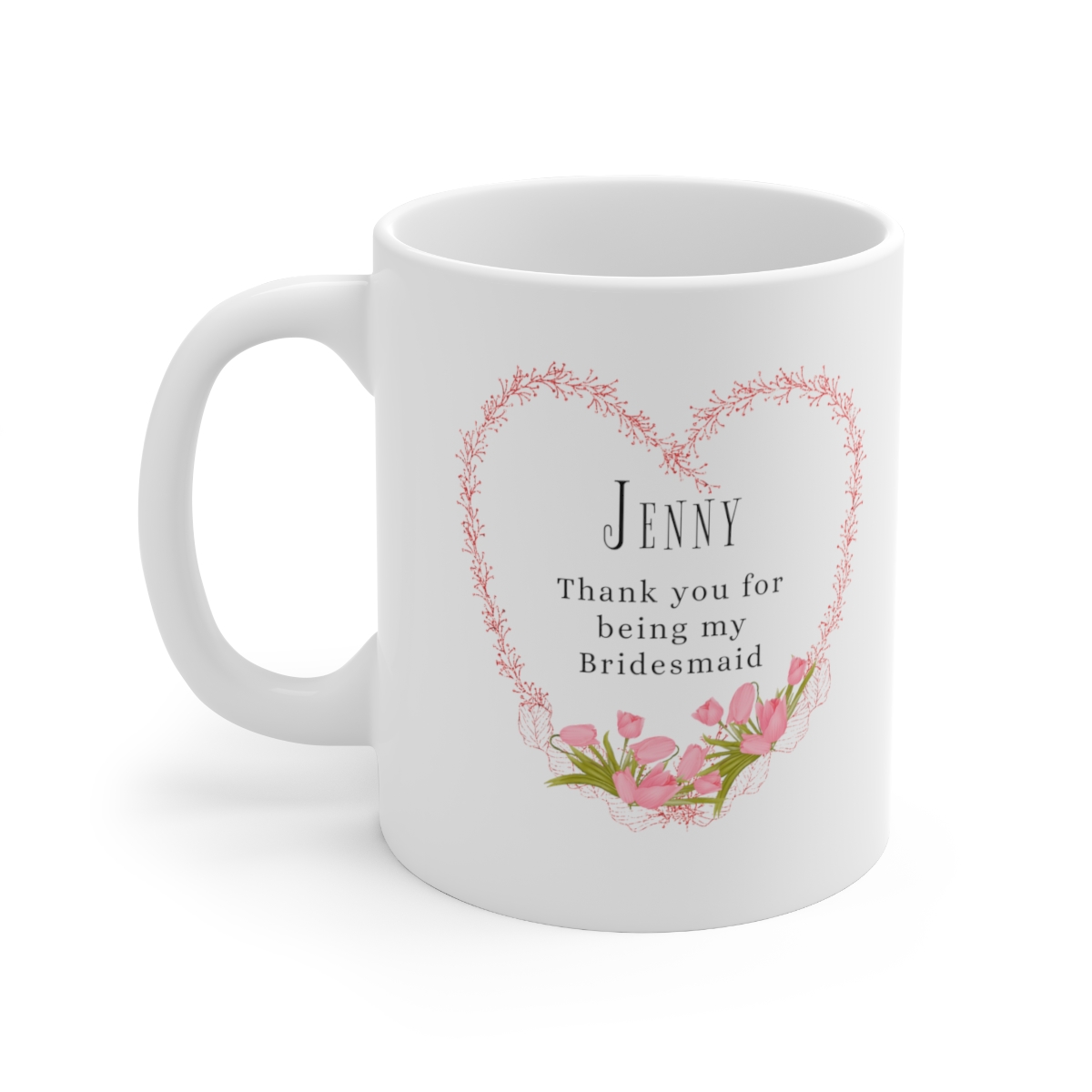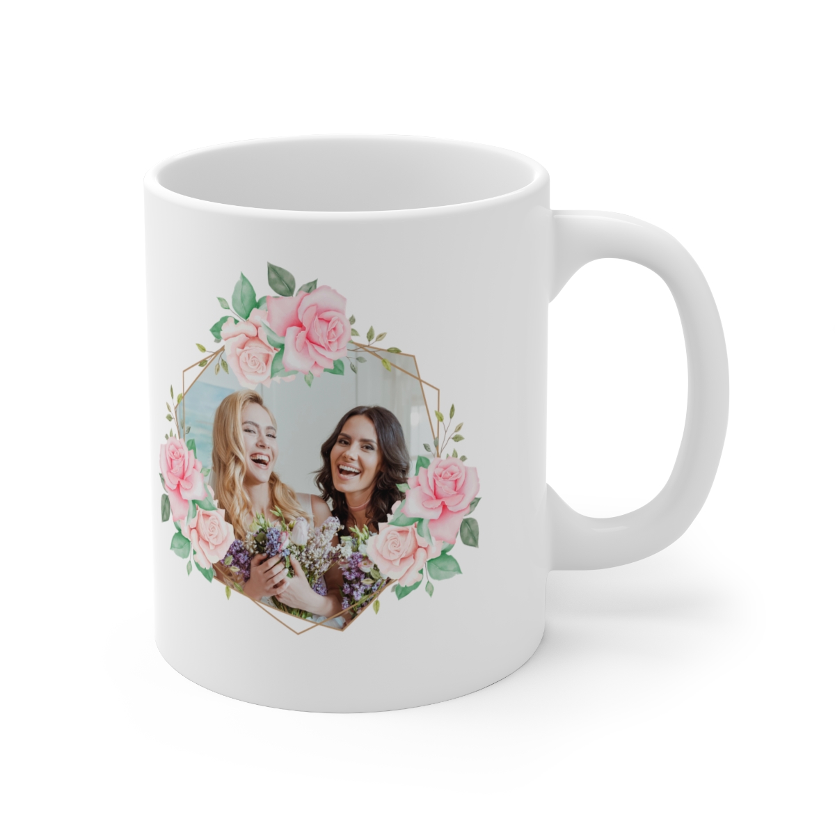 Double sided personalized design. Beautiful floral design with a gold frame featuring a picture of the Bride and Bridesmaid. On the reverse side of the mug, we have a heart-shaped floral design, accompanied with a special personal message.?The design is printed on a durable gloss finished white ceramic mug and is perfect for display
