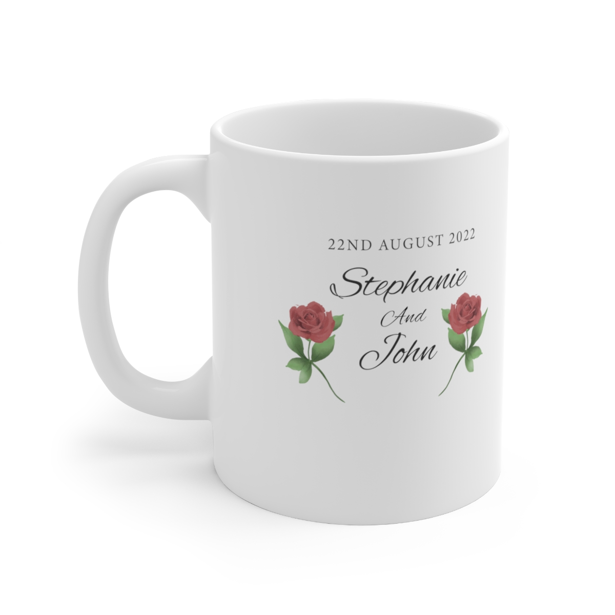 Wedding mug 11oz (0.33l) in size. Each mug is made with durable white ceramic that is perfect for wedding displays and its gloss coating makes for looks that are both pristine and long-lasting.?Gorgeous?Red Rose design?with frame & palette of burgundy, gold, coral rings and blush and leafy greens. Wedding photo is profesionlly masked in to the design using photoshop? Design is printed on a?durable gloss finished white ceramic mug.
